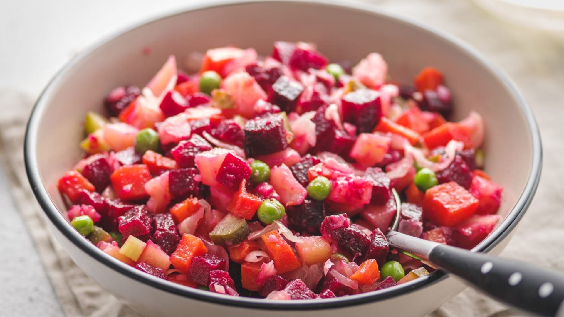 Ruský bramborový salát Vinegret s řepou, mrkví a hráškem