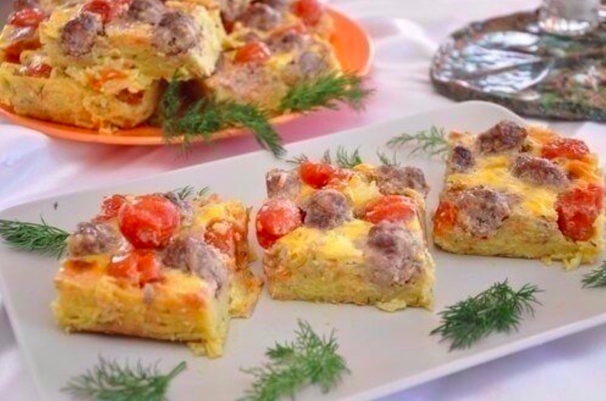 Ingredience 500 g mletého masa 1 kg brambor 300 g cherry rajčat 2 vejce 1 velká cibule 1 mrkev 3 stroužky česneku 3 lžíce krupice 5 lžic majonézy 1 lžička kurkumy 2 lžičky hořčice sůl podle chuti koření podle chuti (např. pepř, kmín) kopr na ozdobu olej na vymazání pekáče Postup přípravy