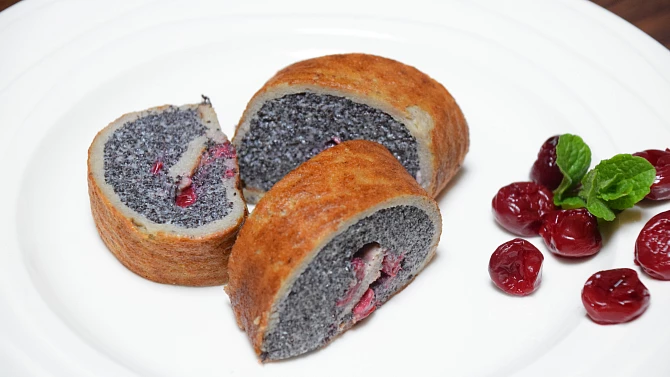 Banánová roláda s tvarohovo-makovou náplní a višněmi