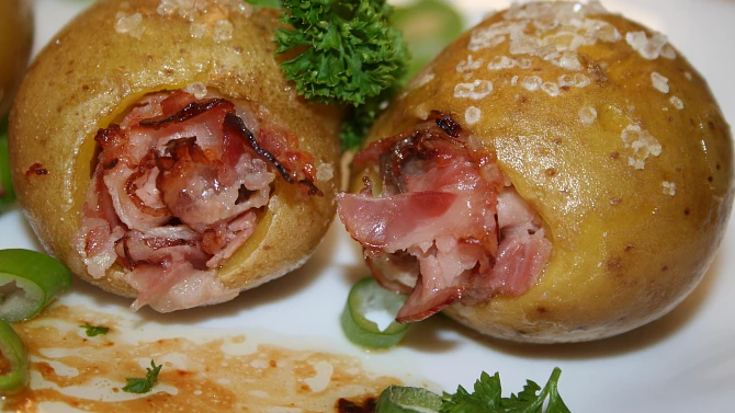 Chystáte slavnostnější večeři a nevíte jakou přílohu zvolit ke steaku? Překvapte své blízké pečenými bramborami, které jsou plněné anglickou slaninou s ančovičkou. Brambory, vonící po šalvěji a česneku, skvěle chutnají i samotné.