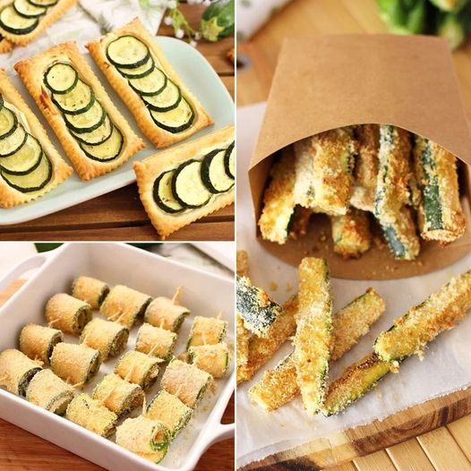 Zde jsou tři jednoduché recepty s cuketou na základě obrázků: 1. Cuketové koláčky z listového těsta Ingredience: 1 cuketa (nakrájená na tenké plátky) Čerstvý tymián nebo rozmarýn Strouhaný parmezán 1 vejce (rozšlehané) 1 plát listového těsta (nakrájený na obdélníky) Sůl a pepř podle chuti Olivový olej Postup: