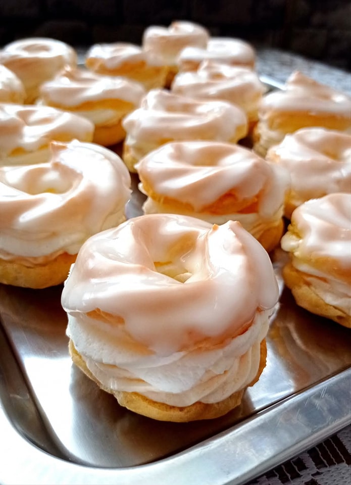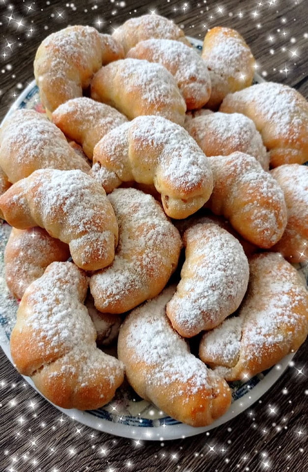 Ingredience: 450 g hladké mouky 200 g zakysané smetany 1 vejce (žloutek) 1 lžíce másla (nebo Hery) Špetka soli 2 vanilkové cukry 250 g mletých ořechů (náplň) Cukr, med, rum, skořice (na ořechovou náplň) Trochu horkého mléka (na zvlhčení ořechové náplně) Mleté piškoty (ke konzistenci náplně) Postup: Příprava těsta:
