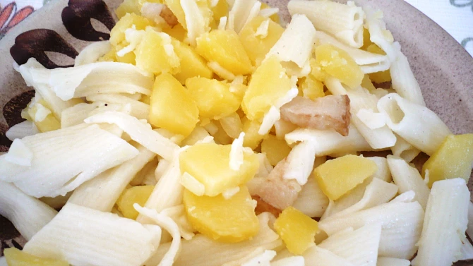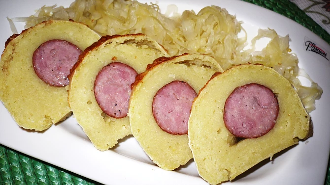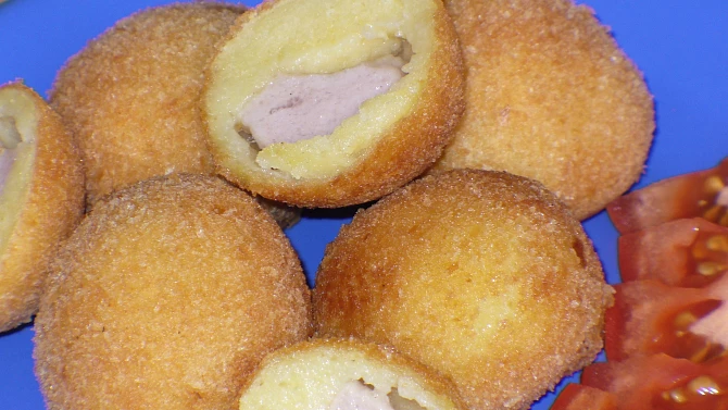Suroviny Porce: cca 20 ks Těsto: 350 g vařených nastrouhaných brambor 140 – 160 g polohrubé mouky (podle typu brambor) 1 vejce sůl 1 – 2 stroužky česneku 200 – 220 g vinné klobásy vajíčko strouhanka na obalení olej Dip: 1 zakysaná smetana 62,5 g Lučina sůl pepř pažitka Postup přípravy
