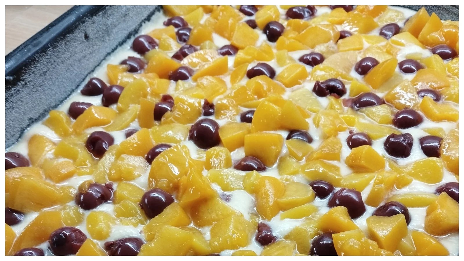 Rychlý drobenkový koláč s kompotovanými broskvemi a višněmi – jednoduchý a vláčný dezert ke kávě