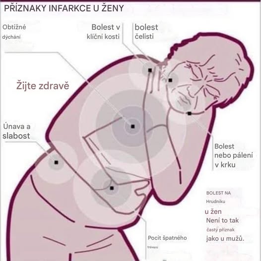 Bolest v jiných částech těla Může se šířit do zad, čelisti, ramen, krku nebo paží