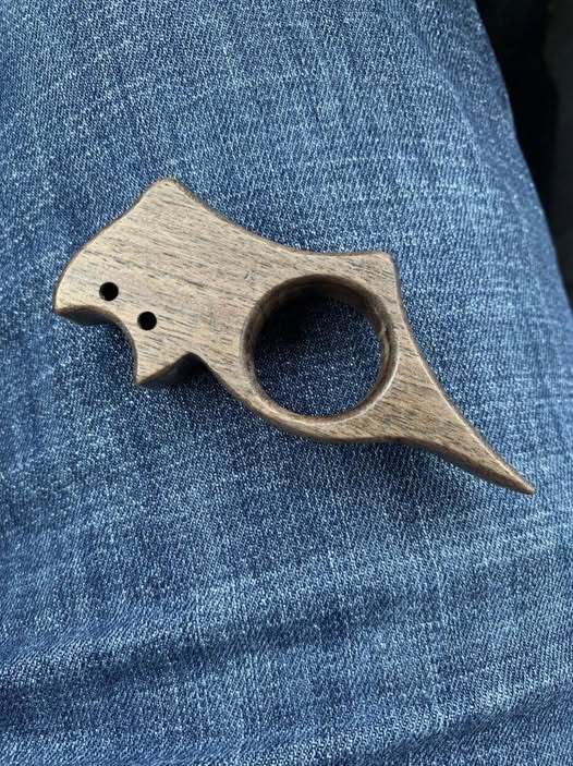 a small, carved wooden object shaped like a fox… or a bat… or possibly a tiny throne for your thumb.