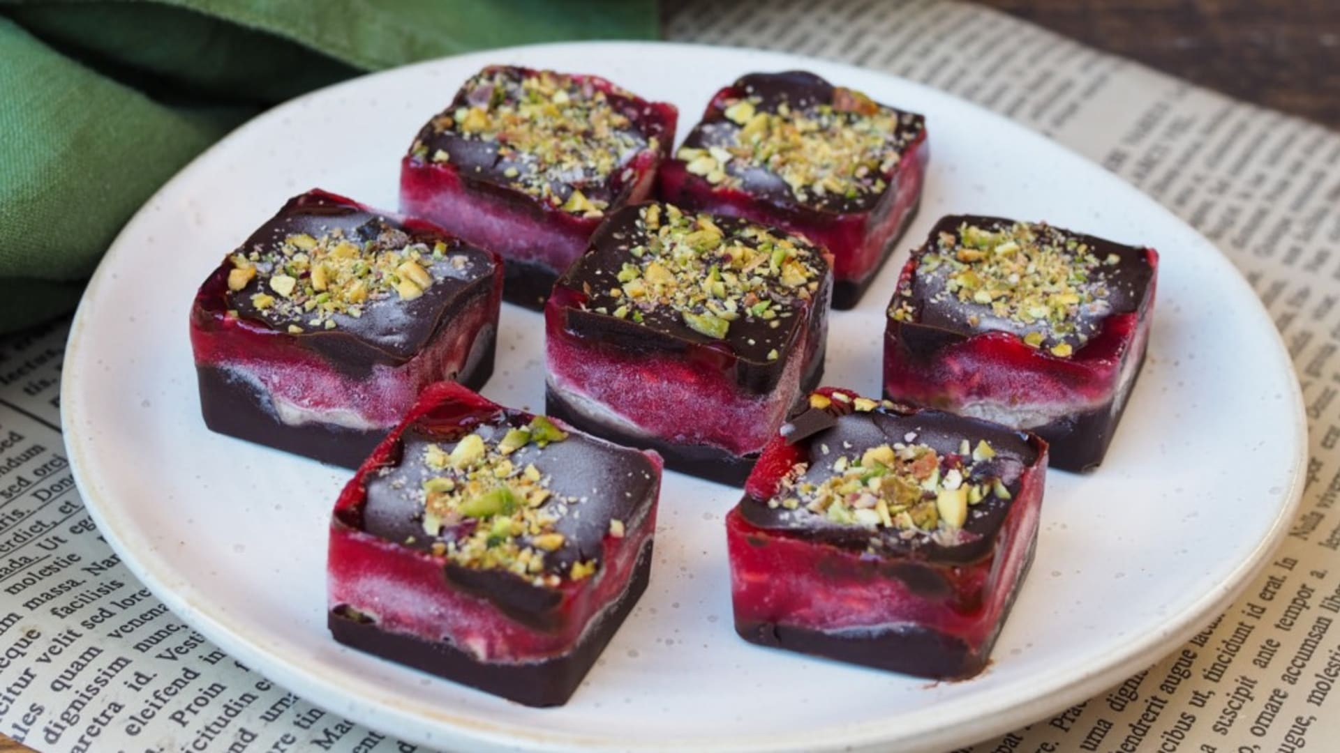 Jednoduchý mražený dezert: Čokoládové kostky s malinami a pistáciemi