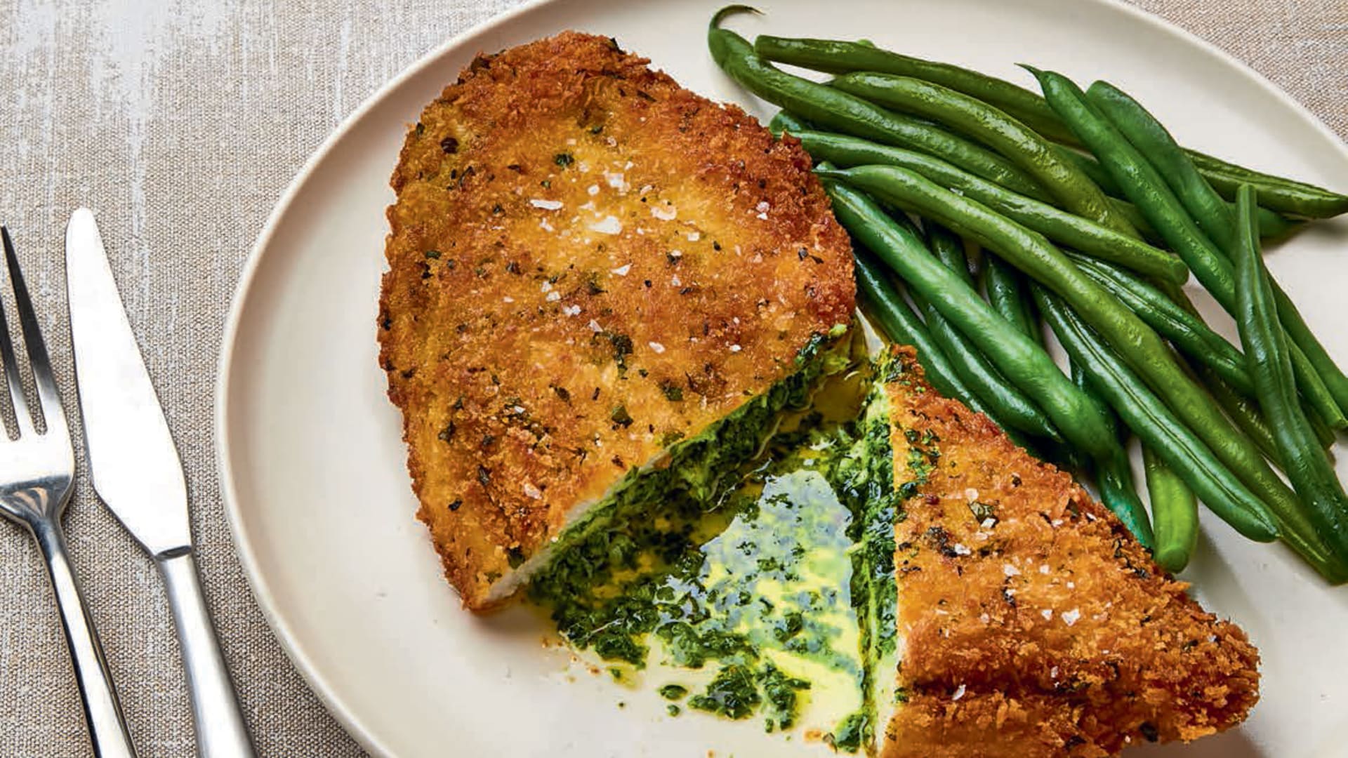 S tímhle retro pokrmem se vracíme zpátky do sedmdesátých let, ale novinkou je použití krůtího masa (prsa jsou o poznání větší a snáze se s nimi pracuje) a medvědího česneku. Výsledkem je rafinovanější chuť. Pokud zrovna není sezona medvědího česneku ani nemáte v mrazáku žádné máslo s medvědím česnekem, přidejte místo něj další stroužek česneku.