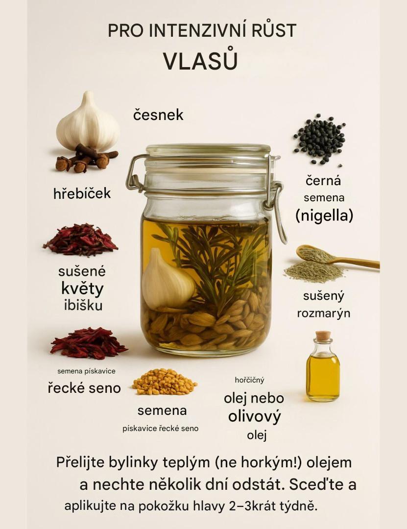Přírodní směs pro jiný růst vlasů! Bylinný olej, který si vaše pokožka hlavy zamiluje – bez chemikálií, ale se silou přírody. Složení: Česnek, hřebíček, sušené květy ibišku, semínka pískavice řecké seno, černá semínka (nigella)💆♀️💪Konec stránky