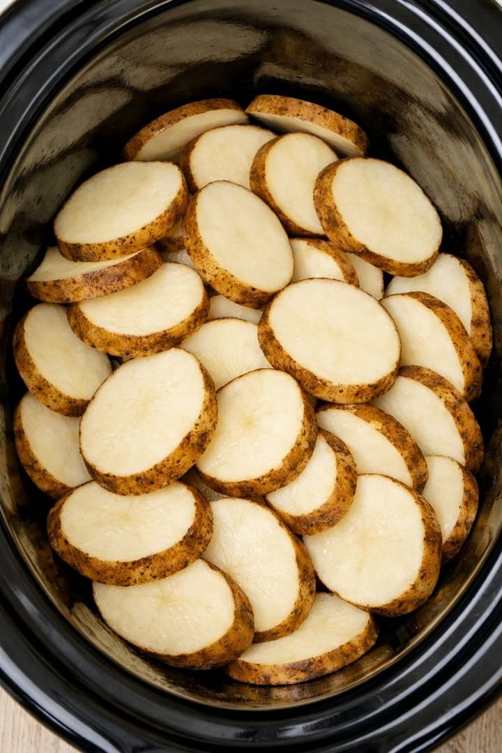 Arrange the unpeeled sliced russet potatoes in the bottom of the slow cooker in an even layer, then continue layering the remaining slices on top, loosely shingling them so there are minimal gaps. This helps them cook evenly and soak up the cream and butter.