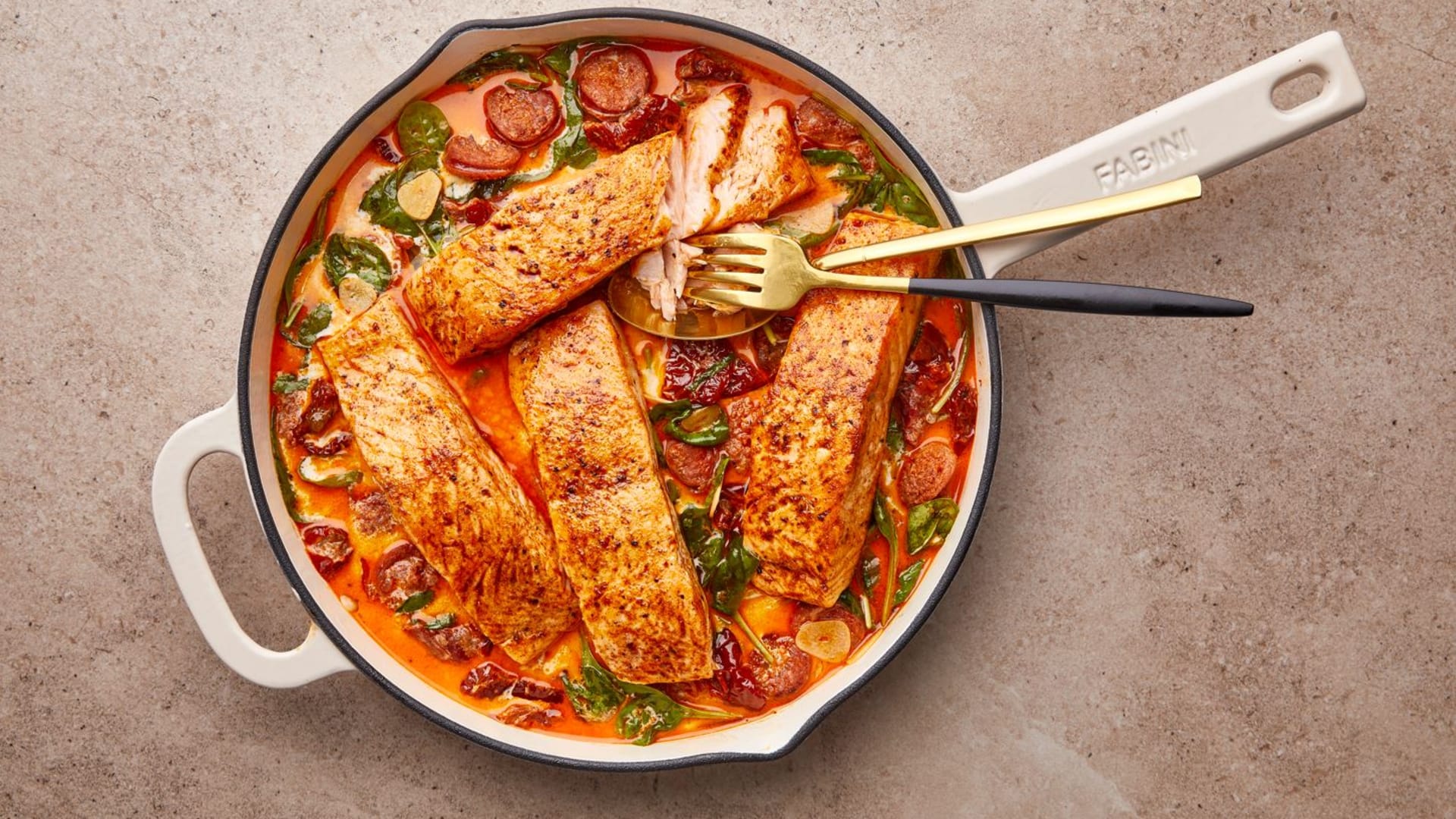 Tohle nejsou klasické těstoviny s lososem, ale filety lososa s omáčkou ze sušených rajčat, pikantního choriza, voňavého česneku a jemného smetanového špenátu. Pozdrav z horkého jihu, který v měsících s nedostatkem slunce přijde vhod.
