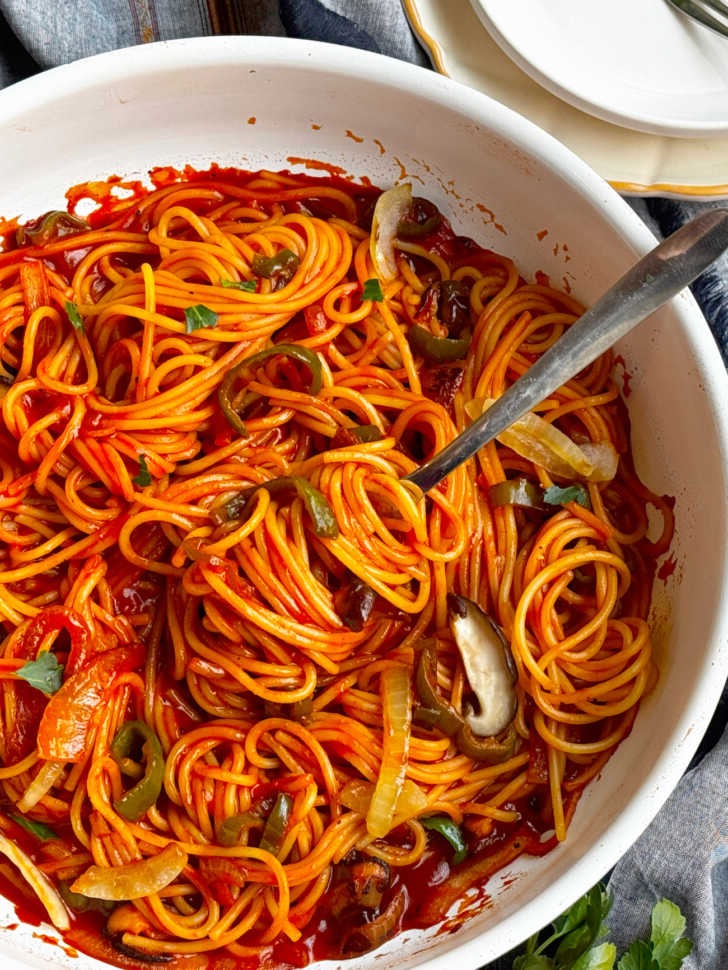 Veggies and Mushrooms: Traditionally, green bell peppers and onions were the only addition to Spaghetti Napolitan, but sliced baby bella mushrooms have made it into the mix.